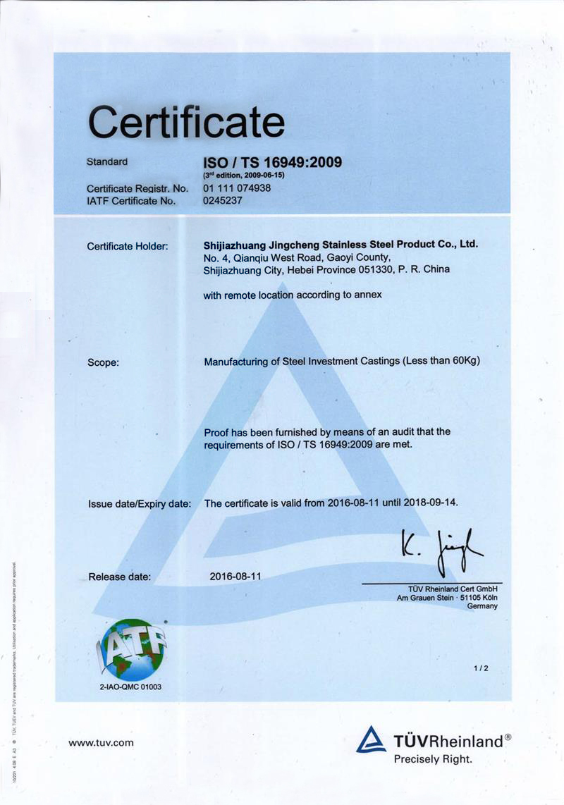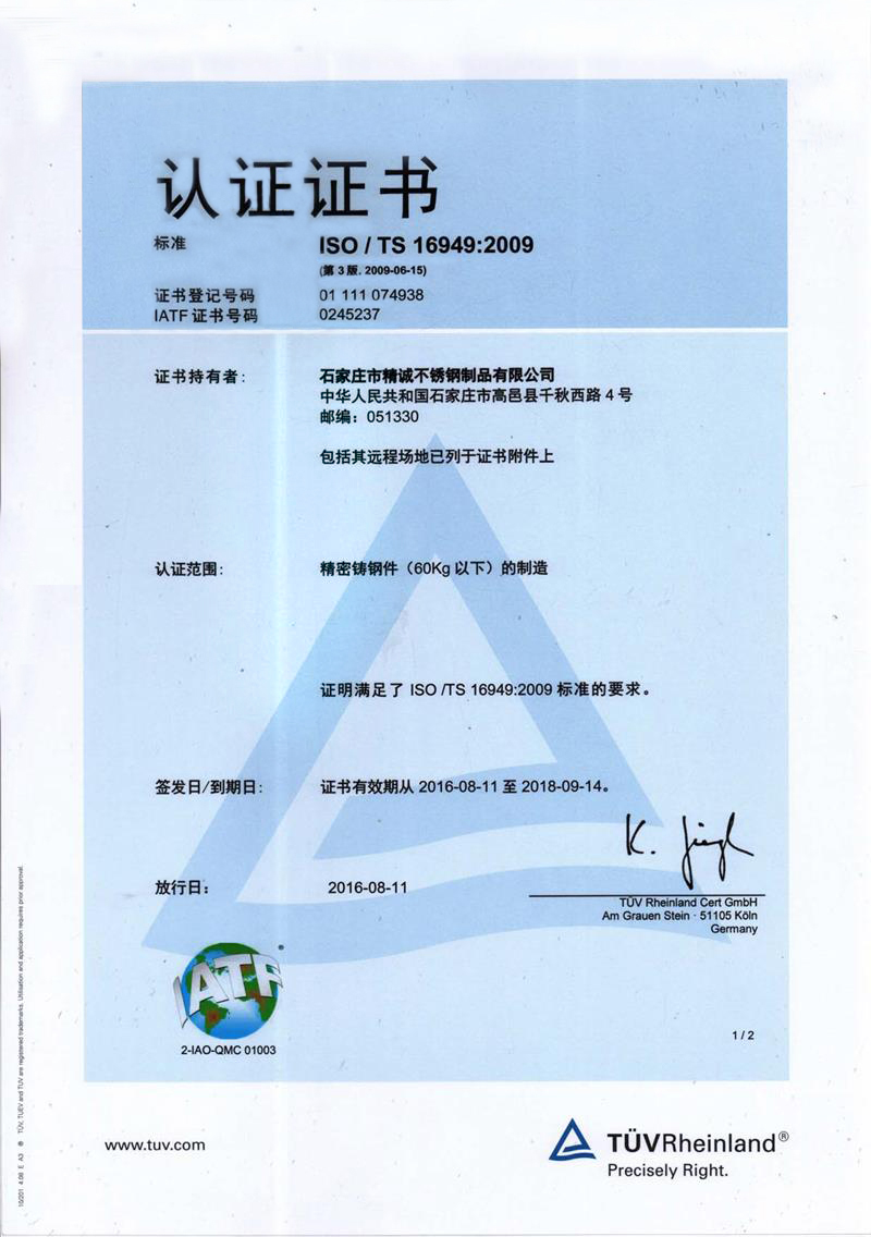 石家莊市精誠不銹鋼制品有限公司,是一家從事專業(yè)精密鑄造的企業(yè)。主要生產(chǎn)不銹鋼、合金鋼、低碳鋼及各種特種合金材質(zhì)的精密鑄件及加工產(chǎn)品。
